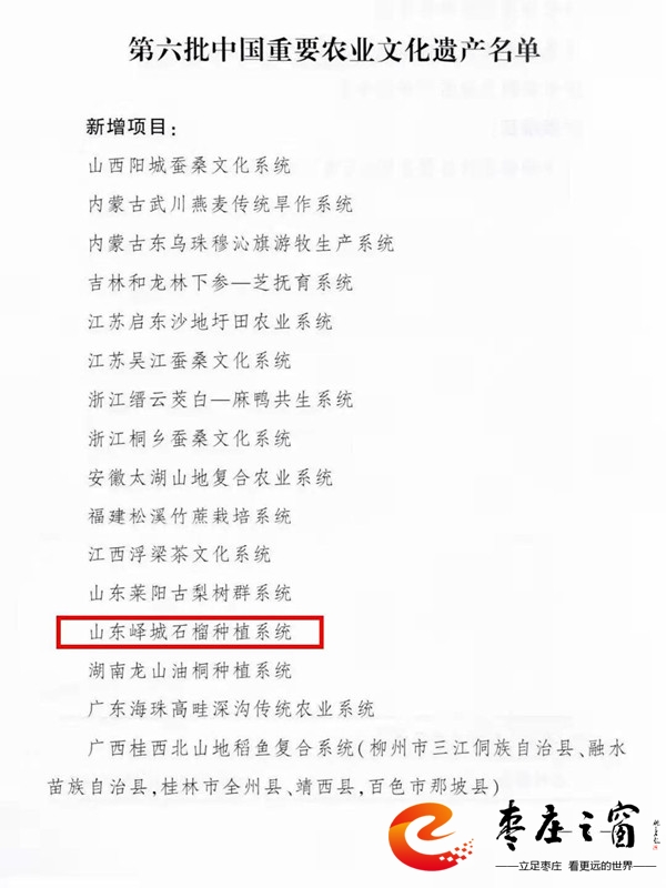 11月16日,農(nóng)業(yè)農(nóng)村部公布第六批中國重要農(nóng)業(yè)文化遺產(chǎn)名單,認(rèn)定山西陽城蠶桑文化系統(tǒng)等21項(xiàng)傳統(tǒng)農(nóng)業(yè)系統(tǒng)為第六批中國重要農(nóng)業(yè)文化遺產(chǎn),其中嶧城石榴種植系統(tǒng)入選。