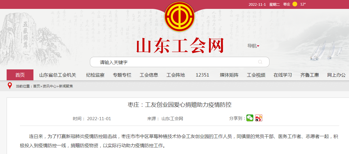 媒體聚焦 | 山東工會(huì)網(wǎng):市中區(qū)草莓種植技術(shù)協(xié)會(huì)工友創(chuàng)業(yè)園愛(ài)心捐贈(zèng)助力疫情防控